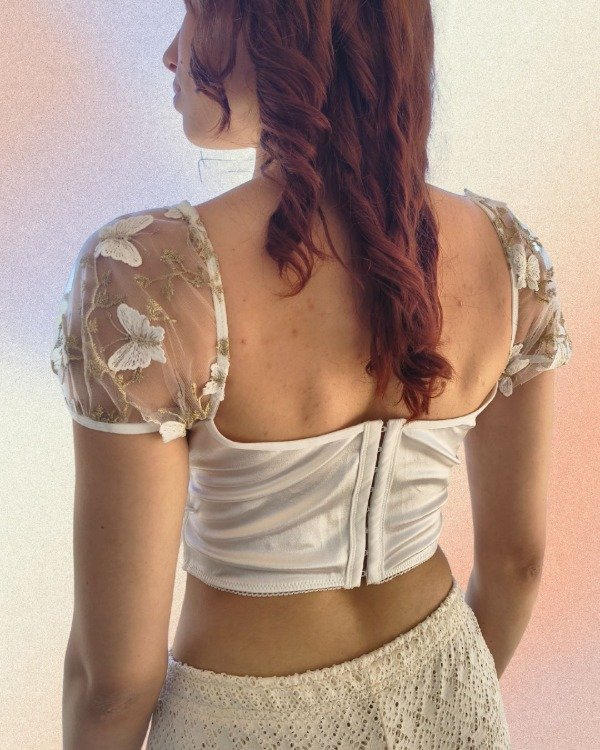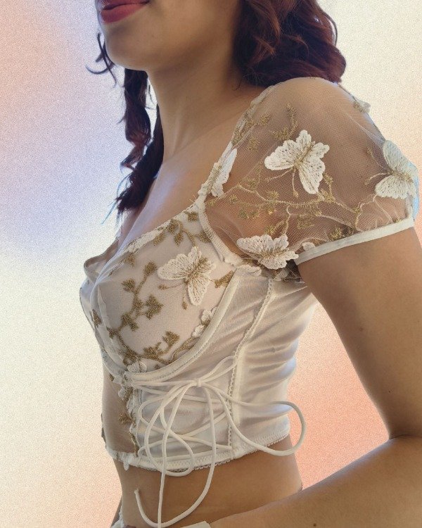 Corset trabajado con tul bordado en flores doradas y blancas, delicado y súper femenino. Posee mangas de tul transparente, copas estructuradas y un panel central en transparencias que realza la figura.