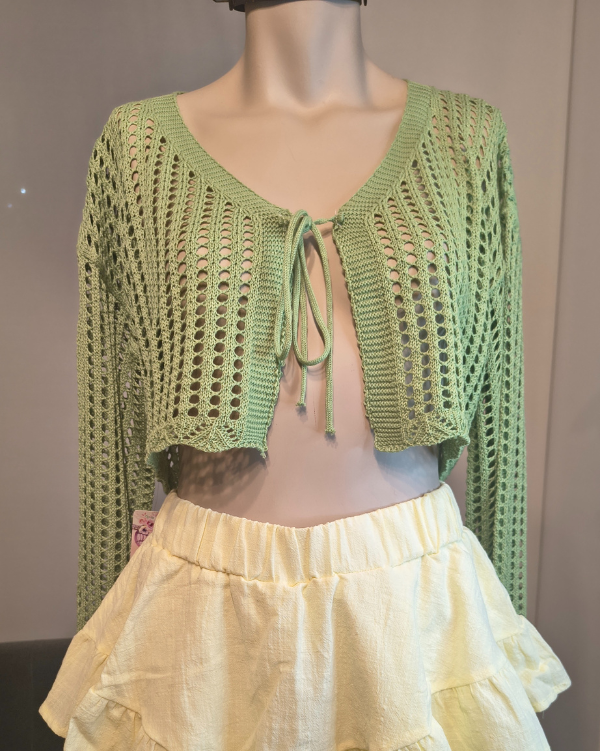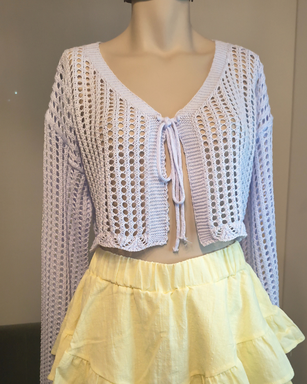 Cárdigan tejido estilo crochet, super liviano y femenino. Tiene un diseño calado que aporta frescura y un lazo frontal que permite ajustarlo a tu estilo. Ideal para usar encima de tops, bodies o bikinis.