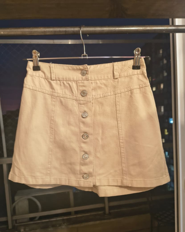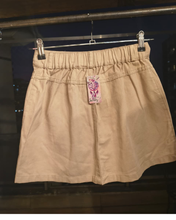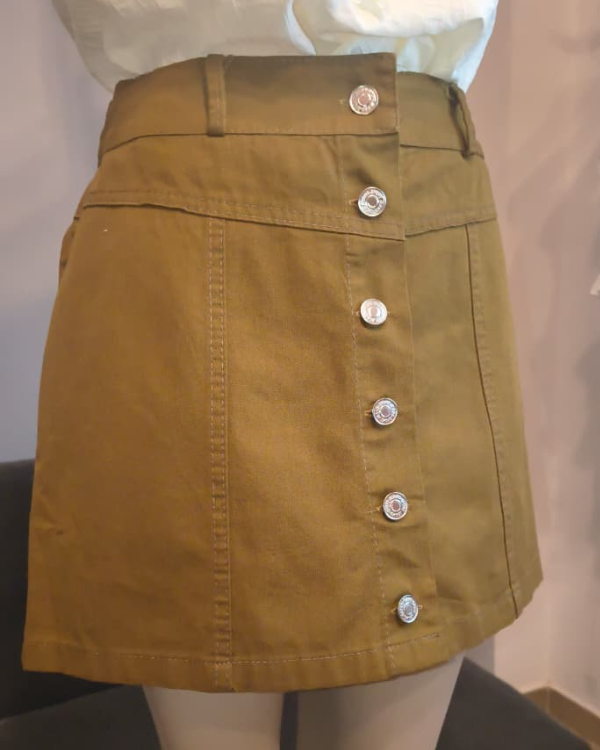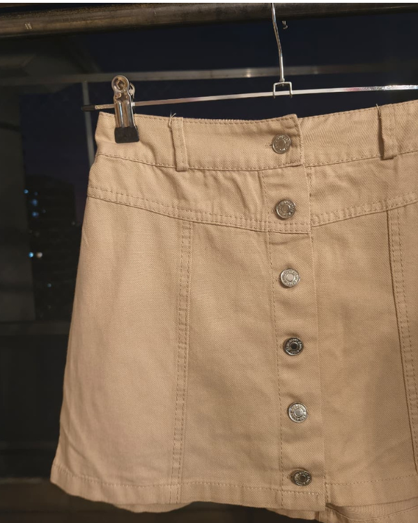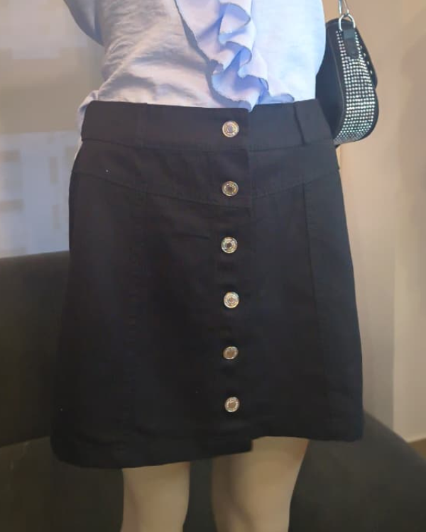 Falda línea A con botones frontales decorativos y cintura alta con elasticidad en la parte trasera. Está confeccionada en tela tipo jean liviana , lo que la hace cómoda, resistente y perfecta para usar todos los días.