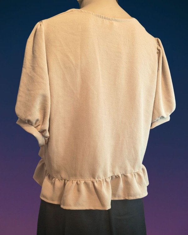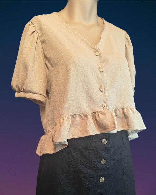 Blusa fresca y femenina. Tiene manga corta tipo princesa, escote en V y botones delanteros. El ruedo con volado aporta movimiento y un toque romántico ideal para looks de día o tarde.