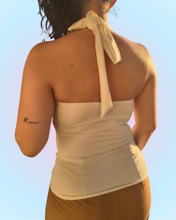 Top halter confeccionado en tela Hawaii semi-elastizada y suave. Presenta un escote profundo con frunce central y detalle en el centro que realza el busto y aporta un toque único.