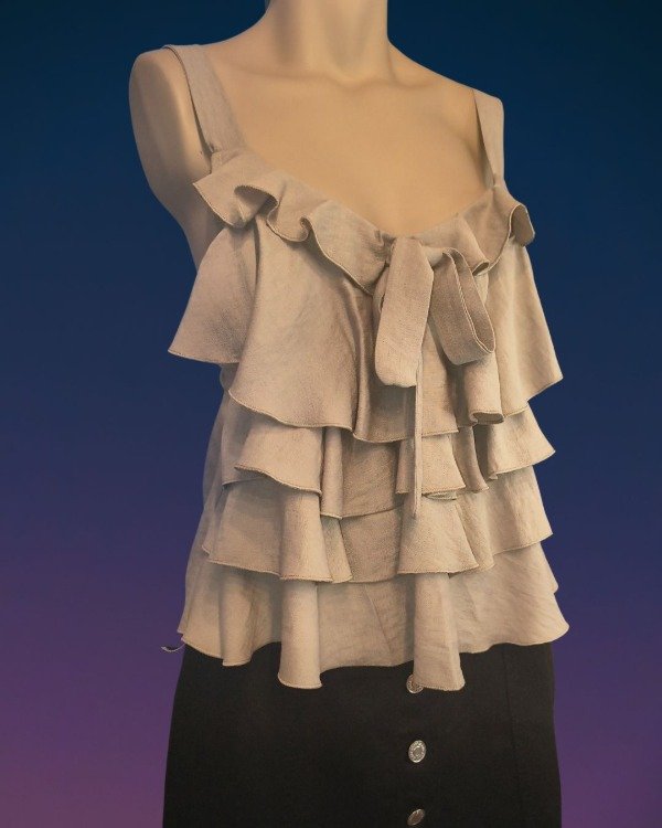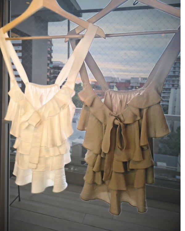 Musculosa súper femenina y fresca, hecha en algodón liviano con caída suave y volados en cascada que estilizan la figura.