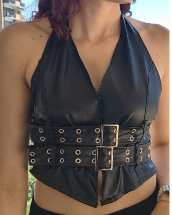 Top halter de eco cuero, con diseño estructurado y detalle de doble cinturón con hebilla y ojalillos metálicos. Ambos cinturones son regulables, lo que permite ajustar la cintura para un calce más entallado o más cómodo según tu gusto.
